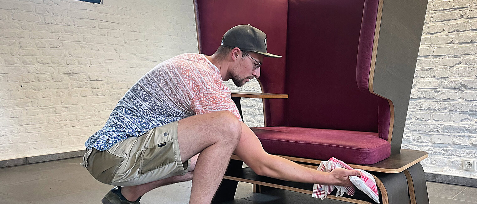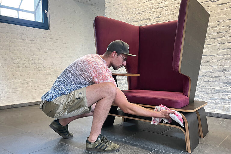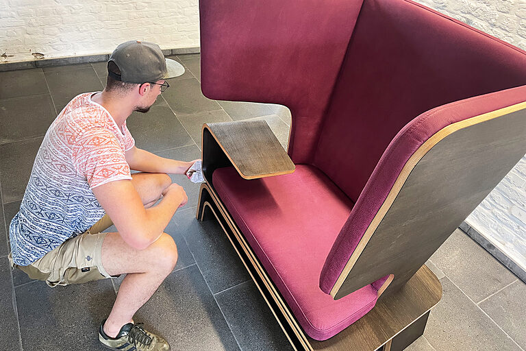 „Bitte abschalten“ heißt es bei dem überdimensionalen Ohrensessel von Sven Kirkskothen. Der Tischler hat einen Mikro-Ort entworfen – ein eigenständiges Büro für das Zuhause, ein Ort-in-Raum-Konzept mit Atmosphäre – für jeden, der in einem Großraumbüro Ruhe benötigt und jene, die im heimischen Wohnzimmer einen definierten, optisch und akustisch abgeschotteten Platz für sich benötigen.